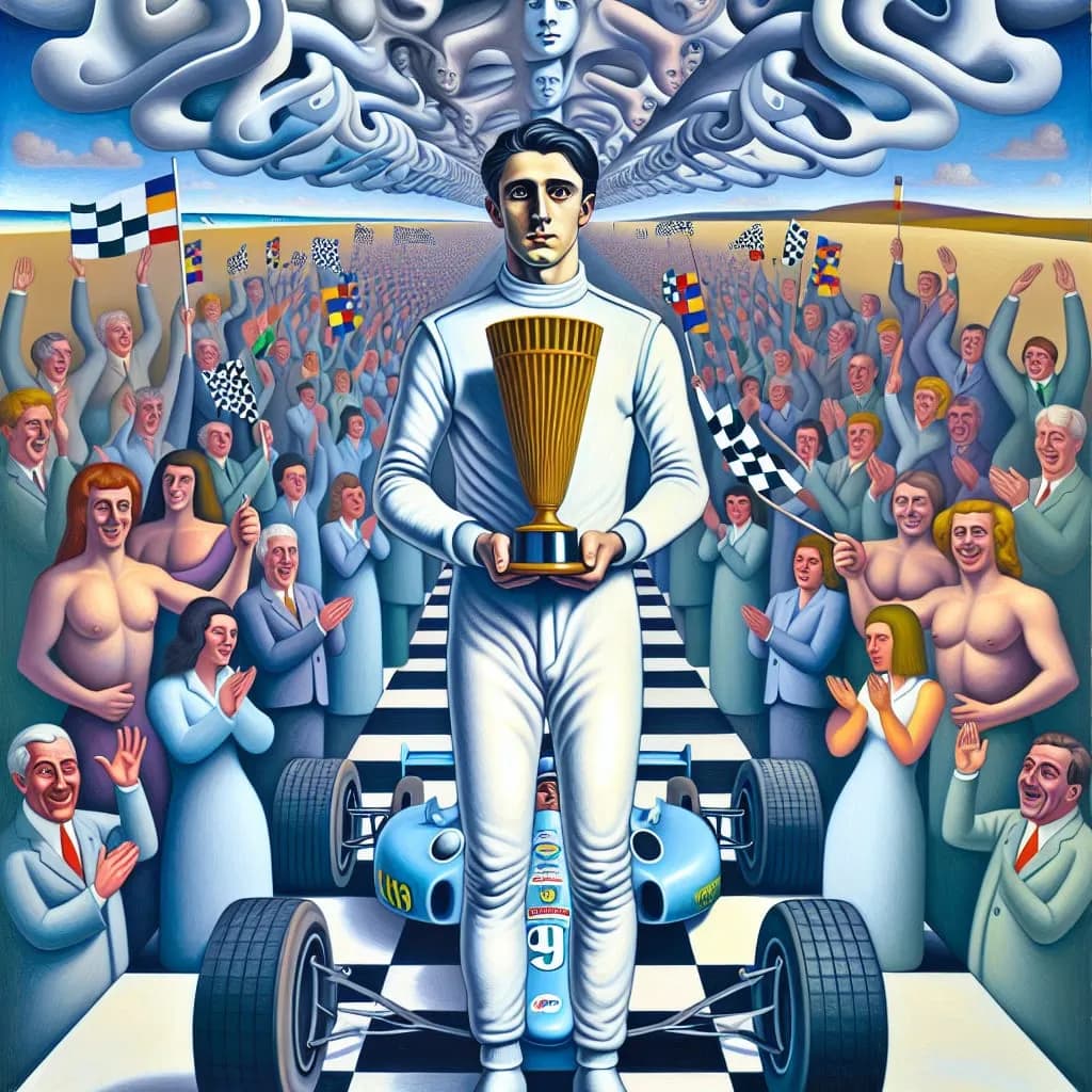 Artist interpretation of Rum Balls Bradford hoisting the Driver's championship trophy